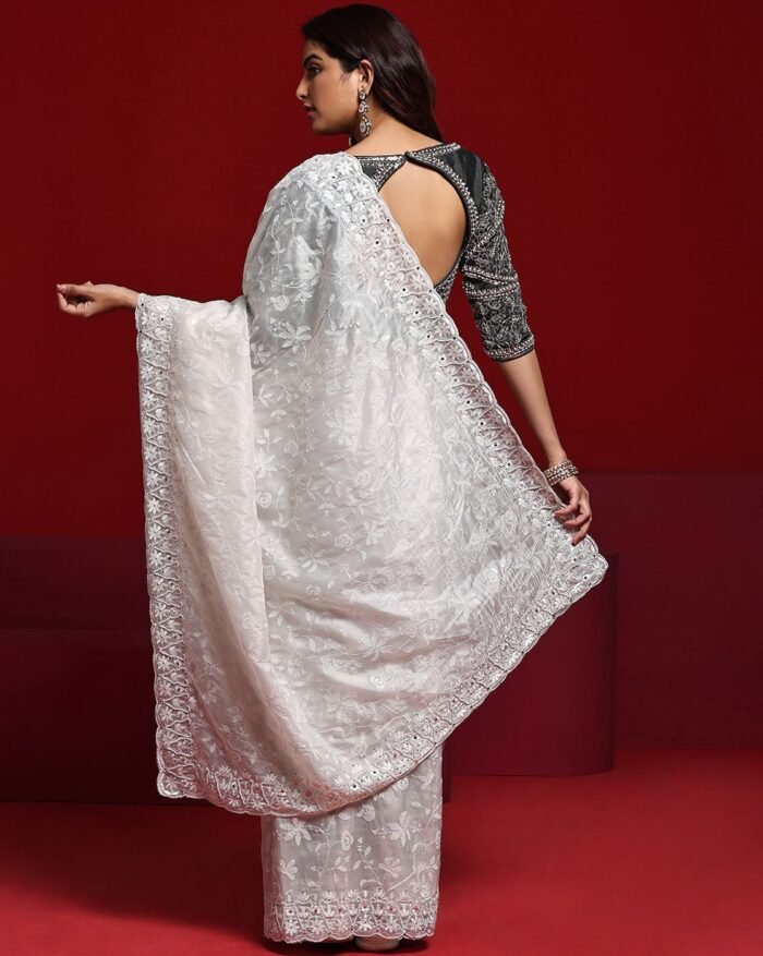 - The last image gives a detailed look of the blouse piece that comes with this saree (The model is wearing a blouse from our in-house wardrobe)