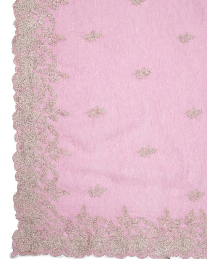 - Full Of Flamingo Pink Color Crushed Organza Saree With Cream Color Thread Work Design On Body And Thick Worked Pallu With Scalloped border And Same Work Blouse